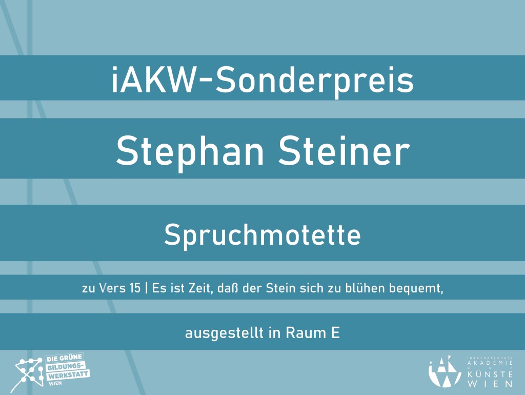 Aus dem Vers „Es ist Zeit, daß der Stein sich zu blühen bequemt“ wurde in Stephan Steiners Auseinandersetzung eine polyphone Spruchmotette mit neo-modernem und gleichzeitig liturgischem Charakter. Alle Chorstimmen selbst eingesungen, wird eine Stimme zu vielen und unterstreicht den inhärenten Wunsch nach Kollektivität. Die getragene, vielstimmige Vortragsweise des Kanons spiegelt die Einsamkeit und die Verbundenheit in Zeiten der Pandemie gleichermaßen wider. Die ausgewählte Verszeile, die metrisch in Anapästen gebunden ist, erhebt sich im Klangerlebnis zu etwas archaisch Kraftvollem, das die