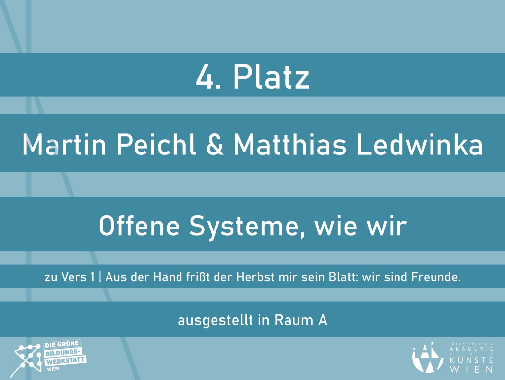 Martin Peichl hat den ersten Vers „Aus der Hand frißt der Herbst mir sein Blatt: wir sind Freunde“ aus Celans Corona segmentiert und mit eigenen poetischen Textfragmenten konterkariert, die aus einer gemeinsamen Arbeit mit Fotos von Matthias Ledwinka stammen. Hier eingereicht ist eines der Fotos, das dem Thema des Verschwindens gewidmet ist. Bild und Text erzählen zusammen davon, wie sich Menschliches entzieht, wie aus lebendigen Situationen Leben verschwindet, wie Leere anstelle eines Erfülltseins tritt und wie dadurch das zu verschwimmen beginnt, was wir Zukunft nennen. Unter dem Titel „Offene Systeme, wie wir“ lesen wir 5 Textminiaturen, die im Wesen einer Zweier-Beziehung das erforschen, was im Verschwinden begriffen ist, ein erhellender Kommentar zu Celans herbstlich-melancholischem Enigma, das wir heute wie eine Anspielung auf die Pandemie lesen.